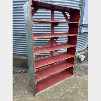 Wooden factory shelves, originally from the Atlas Foundry Works in Earls Colne, Essex (now converted to residential). The shelves are pine and retain their original painted finish. Many factories used this light blue colour on their fixtures and the inside surfaces are a classic red oxide colour, again used a lot in industry. The shelves are string and sturdy with central support brackets and four wooden braces at the back. There is a small wooden trim running on the front and sides flush with the bottom shelf. 181cm high x 126cm wide x 34cm deep. Then internal height between the shelves is 26.5cm apart from the top shelf at 26cm and the bottom shelfat 30.5cm.