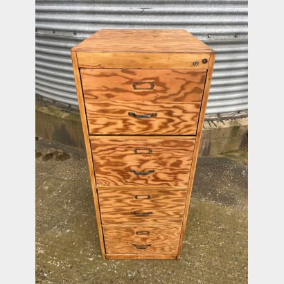 A rare 1940s wooden filing cabinet. This is a Government issue cabinet which retains all of its original steel handles, stamped G R . The drawer fronts also have brass label holders. Each drawer has steel frames to support modern suspension files. This cabinet is an example of an early use of plywood over a pine frame. The drawers all run well on their wooden runners. There have been some repairs to the bottom back sections of the side panels which can be seen in the photos. There are also some historic evidence of woodworm in the side panels and the whole cabinet has been treated as a precaution. After sanding and cleaning the cabinet has been finished with a low sheen water based varnish. The back panel has been replaced with a new piece of plywood. It is now sturdy and ready for use.51cm wide x 65cm deep x 132cm high