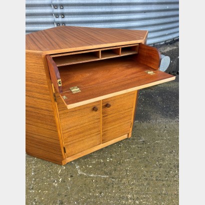 Appearing to be a simple corner cupboard at first glance the top drawer of this cabinet pulls out to reveal a desk, the front of the drawer dropping to form part of the work surface. This is modelled on the original design of the secretaire cabinet. Below the drawer is a cupboard with a single shelf. Although there is no makers mark this cupboard looks to have been made by Meredew from its construction and overall look. 69cm x 69cm. 72cm depth from the back corner to the front face. 77cm overall height. Desk height 64cm.