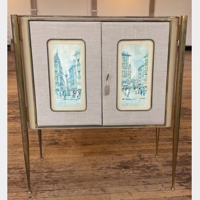 A substantial Italian drinks cabinet with inset prints of stylised European street scenes. The cabinet is raised on tapering brass legs. The top of the cabinet body features an inset sheet of glass. The wooden doors have a hessian covering with the prints inset into brass trimmed glazed frames. The interior of the cabinet is birch lined and has a single glass shelf. The cabinet locks and still retains its original key. 110cm wide x 46cm deep x 125cm total height, cabinet body 76cm high.