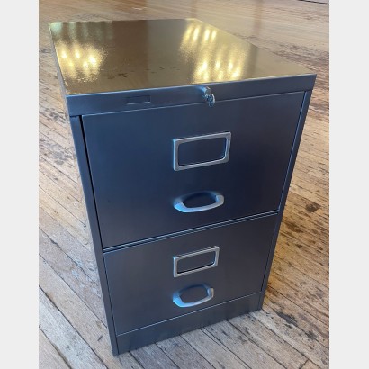 A 1960s polished steel two drawer filing cabinet, probably made by Sankey Sheldon from the design of the handles and label holders. The cabinet has a working lock with key and also hanging rails for modern suspension file holders. The drawer slides run freely. The cabinet has been polished and lacquered. There is a small darker area of steel on the top that wouldn't polish out and also a minor dent on the right hand side where the side panel joins the top section. Neither issue detracts from the overall look of the cabinet and are in keeping with its age. 46cm wide x 63cm deep x 71.5cm high