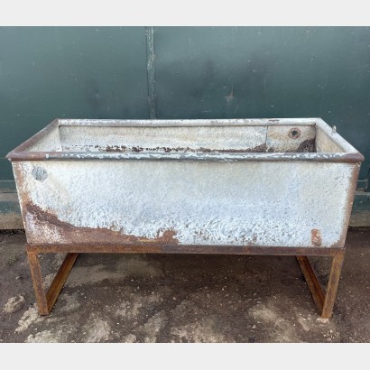 A galvanised cattle trough with round profile lip. A very solid tank that has gained a wonderful patina after years in a field. Sitting on a handmade rusty steel stand. Please note, this tank isn't water tight and has small drainage holes in the bottom.122cm wide 50cm deep 74cm high tank 43cm high