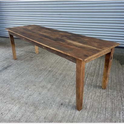 A handmade reclaimed elm table. Four plank top with 'cheeseboard' ends. Tapering square legs. The legs are removeable for easy delivery/installation. The stunning grain and patina is brought out with the oiled finish that gives the table an easily maintained wipe clean surface. Being hardwood this table could also be used outside although it would need to be covered in winter and very bad weather.225cm long 73.5cm deep 75cm high 63.5cm internal height