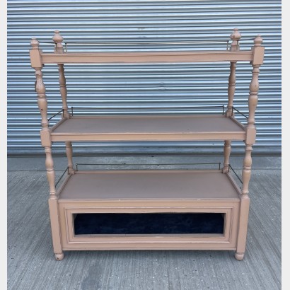 A vintage painted wooden 'whatnot', three tiers and a lower open storage area with a zinc base. The three tiers each have a brass gallery on three sides. The back panel is finished in the same way as the two sides meaning that this could be used as a centre piece as well as against a wall. The paint colour is a classic 19th C 'drab' colour as seen in service areas and kitchens of country houses. The timber under the paintwork look to be mahogany. The opening for the lower storage area is 17cm high. The internal height between the lower tiers is 38cm.122.5cm wide 46cm deep 145cm high to top of finial
