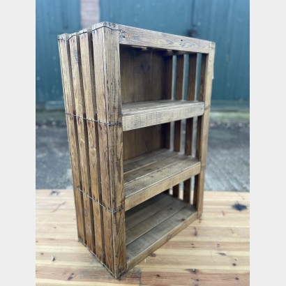 A large vintage slatted pine produce crate with two added internal shelves. The crate has been sanded and finished with a low sheen water based lacquer, retaining its timeworn colour. From top to bottom the internal shelf opening heights are 21cm , 24cm and 23cm.61cm wide 31cm deep 90.5cm high