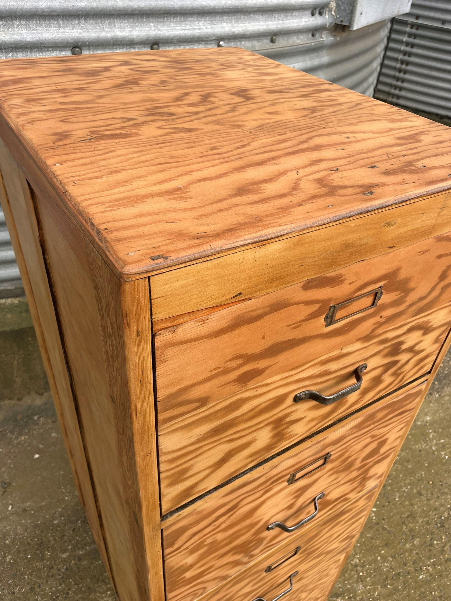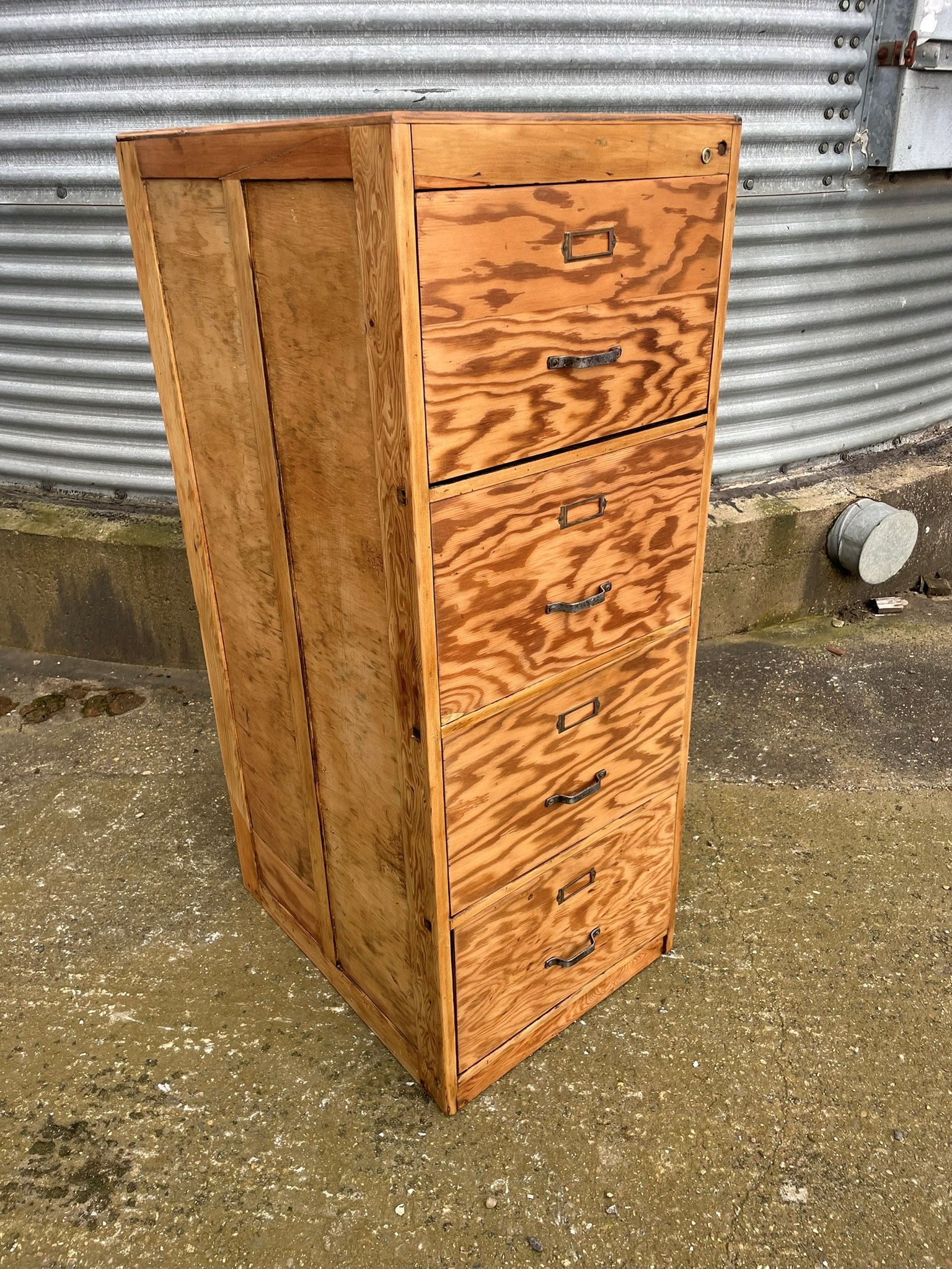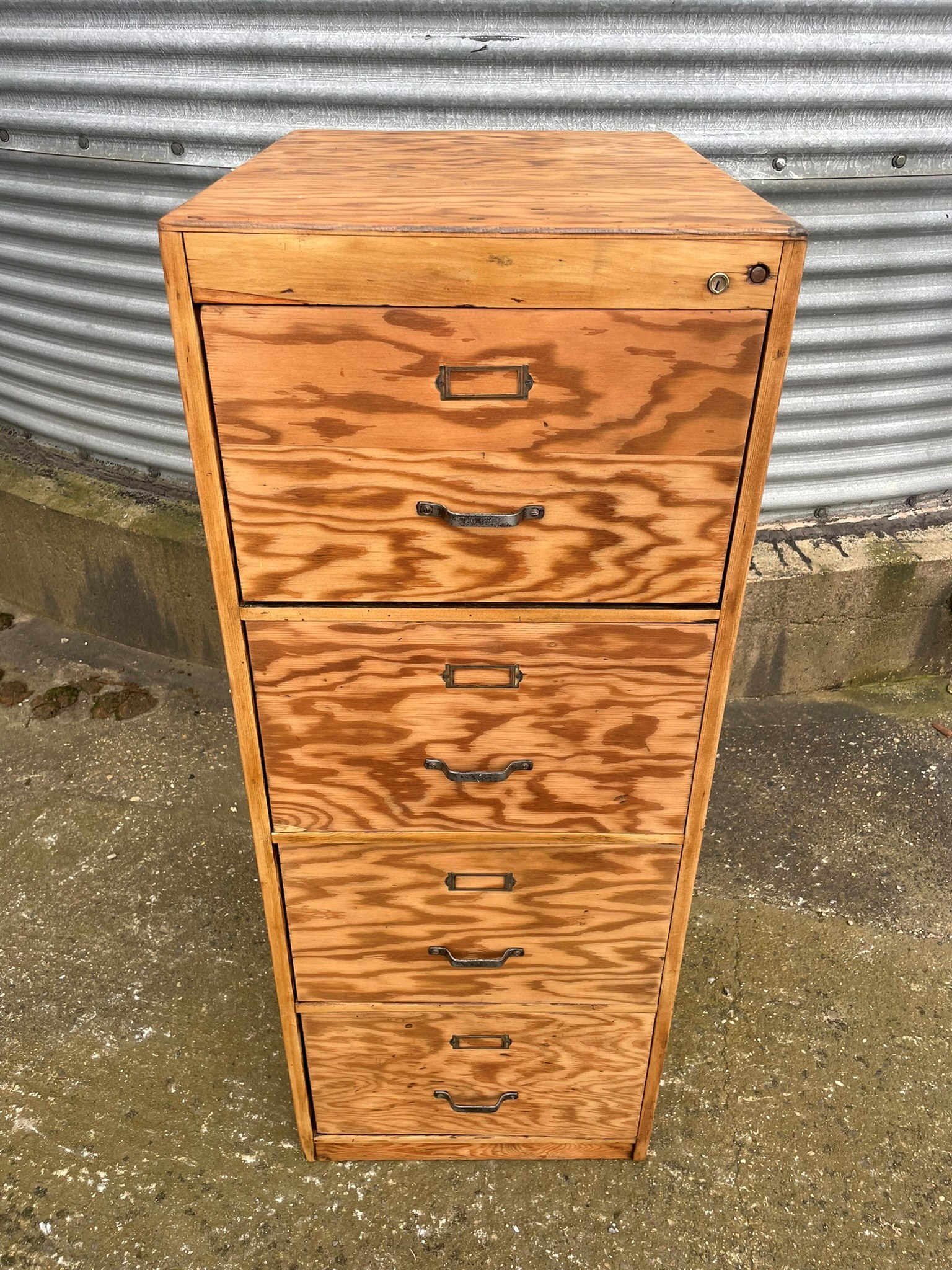 A rare 1940s wooden filing cabinet. This is a Government issue cabinet which retains all of its original steel handles, stamped G R . The drawer fronts also have brass label holders. Each drawer has steel frames to support modern suspension files. This cabinet is an example of an early use of plywood over a pine frame. The drawers all run well on their wooden runners. There have been some repairs to the bottom back sections of the side panels which can be seen in the photos. There are also some historic evidence of woodworm in the side panels and the whole cabinet has been treated as a precaution. After sanding and cleaning the cabinet has been finished with a low sheen water based varnish. The back panel has been replaced with a new piece of plywood. It is now sturdy and ready for use.51cm wide x 65cm deep x 132cm high