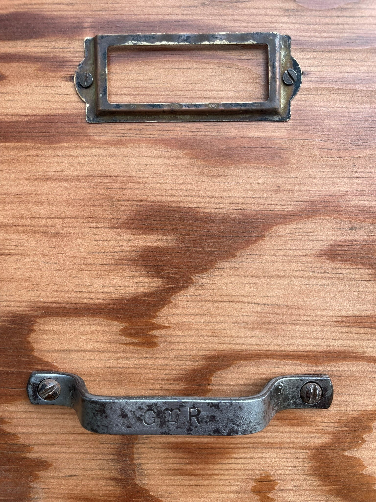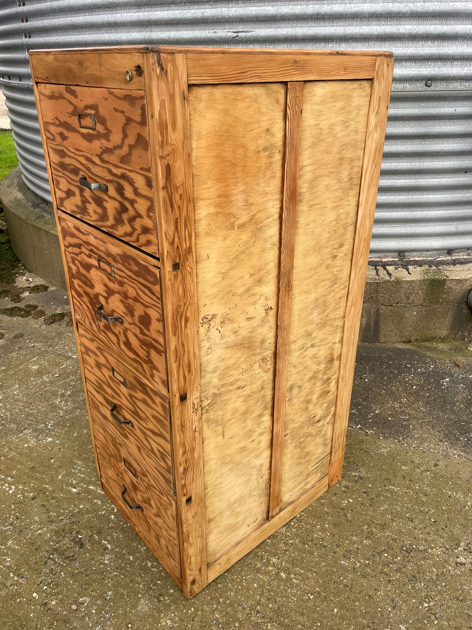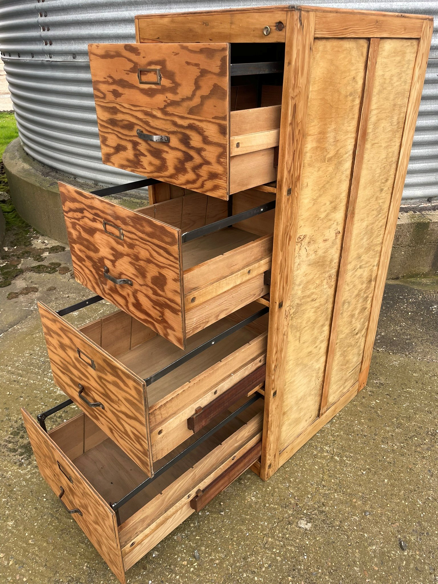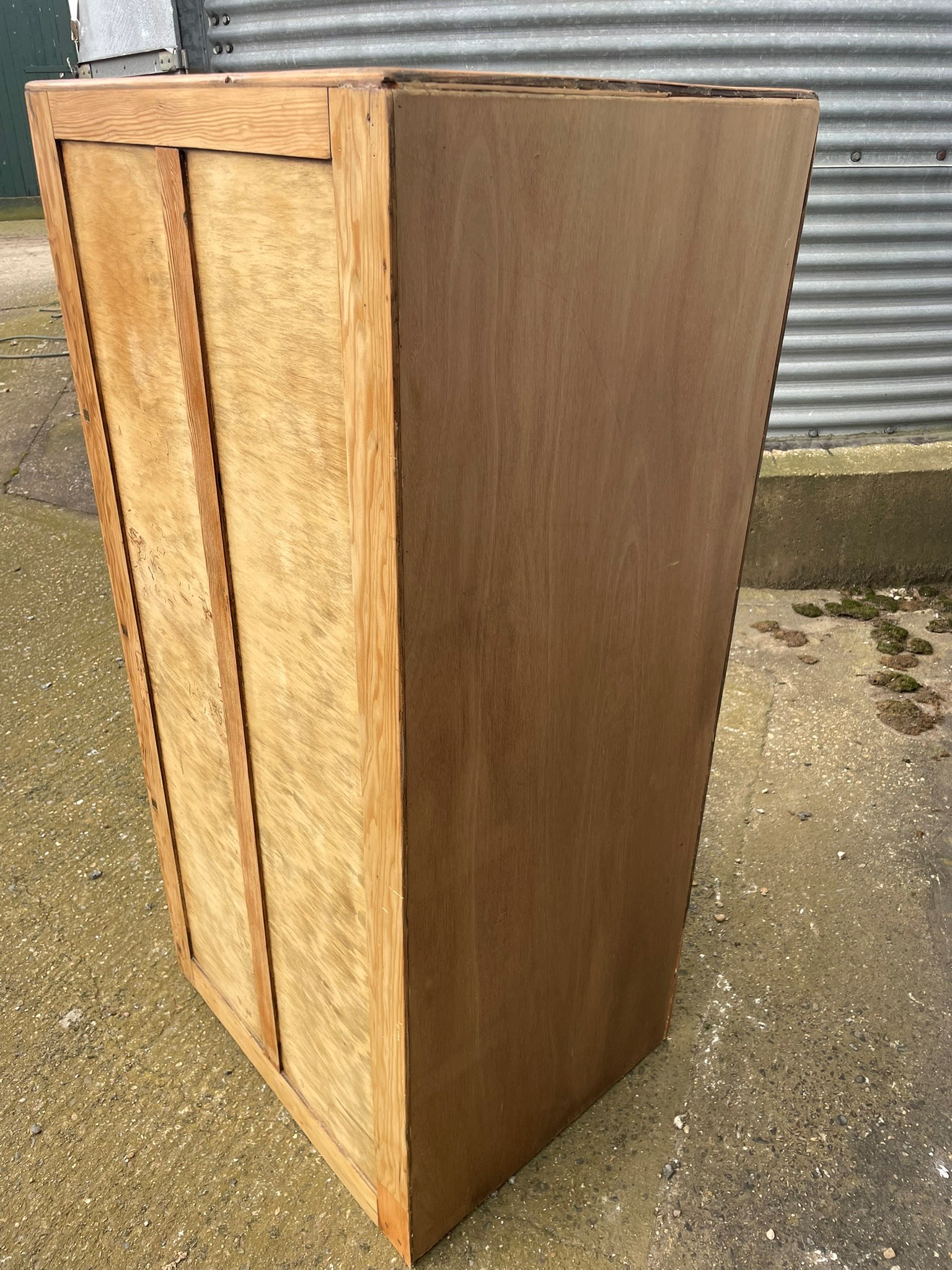 A rare 1940s wooden filing cabinet. This is a Government issue cabinet which retains all of its original steel handles, stamped G R . The drawer fronts also have brass label holders. Each drawer has steel frames to support modern suspension files. This cabinet is an example of an early use of plywood over a pine frame. The drawers all run well on their wooden runners. There have been some repairs to the bottom back sections of the side panels which can be seen in the photos. There are also some historic evidence of woodworm in the side panels and the whole cabinet has been treated as a precaution. After sanding and cleaning the cabinet has been finished with a low sheen water based varnish. The back panel has been replaced with a new piece of plywood. It is now sturdy and ready for use.51cm wide x 65cm deep x 132cm high