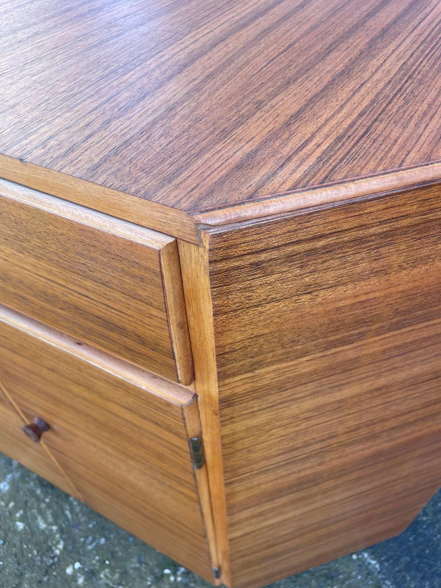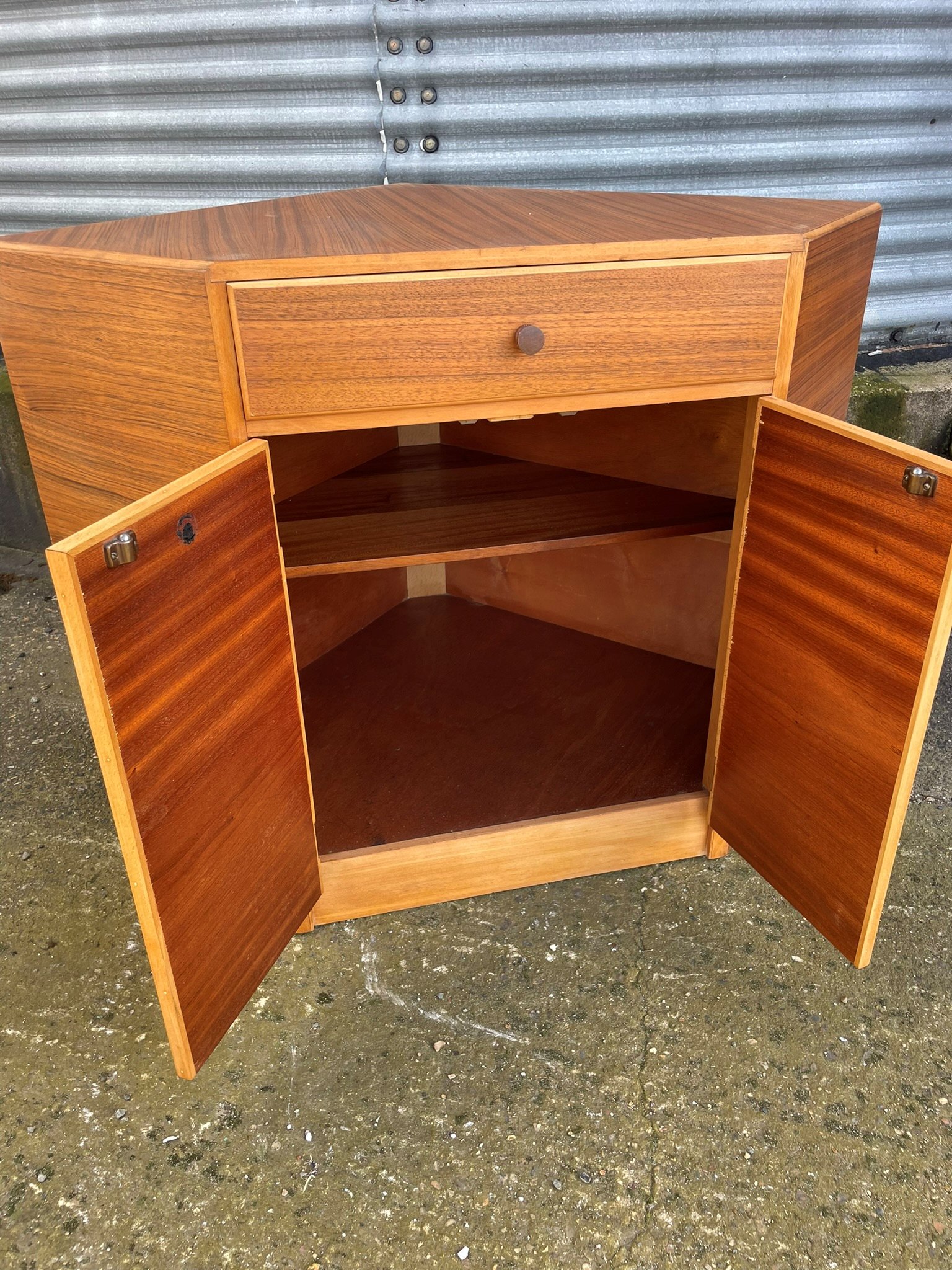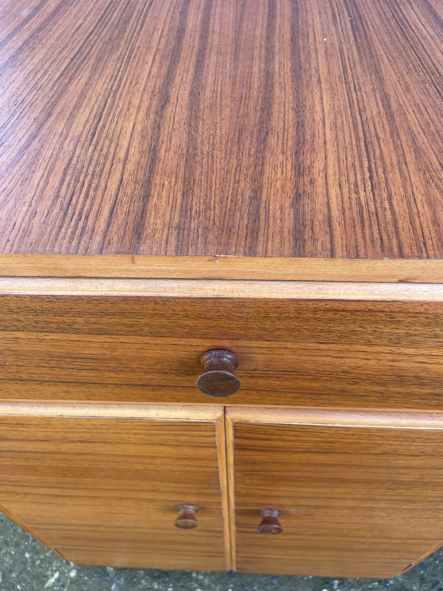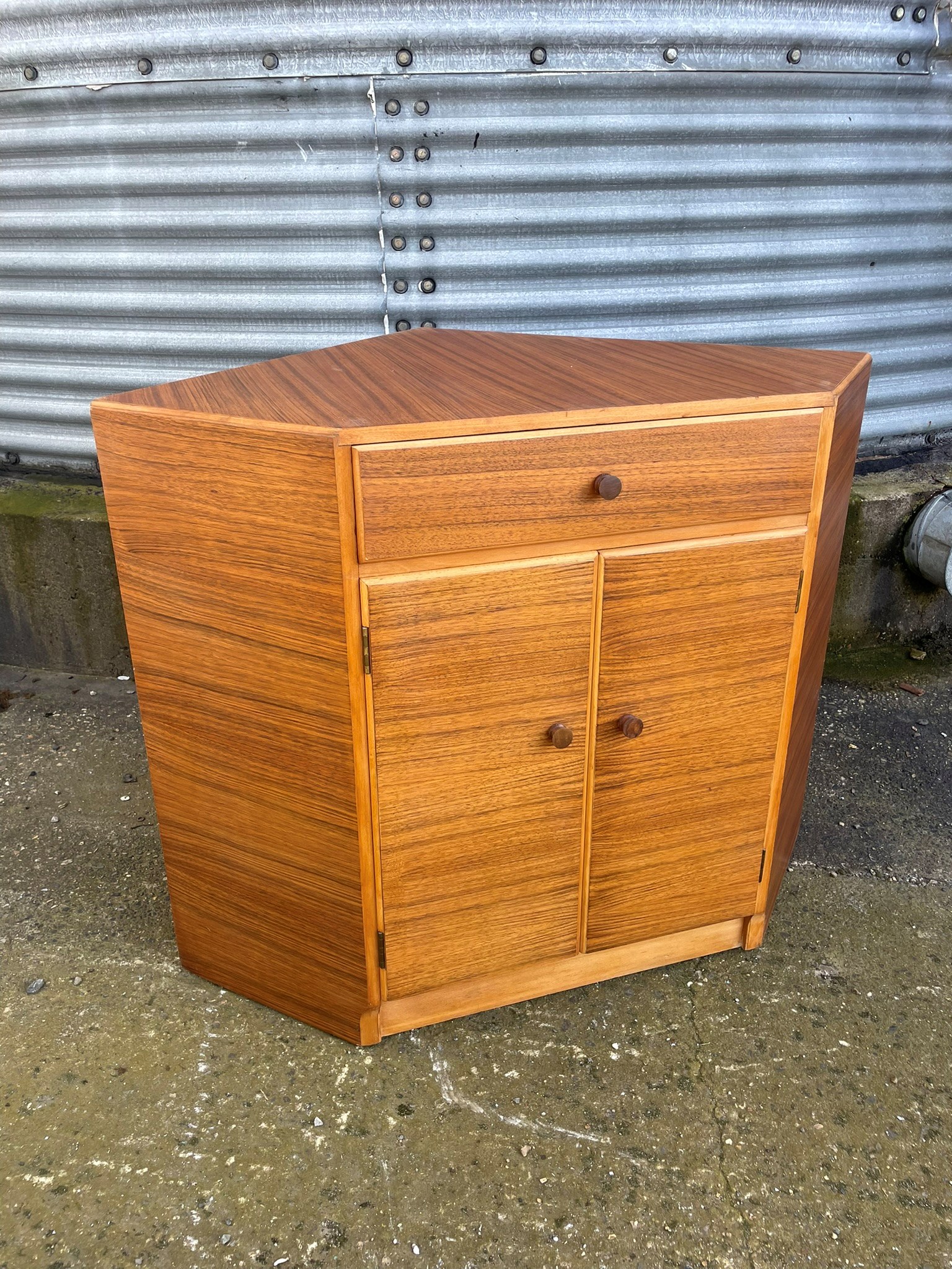 Below the drawer is a cupboard with a single shelf. Although there is no makers mark this cupboard looks to have been made by Meredew from its construction and overall look.