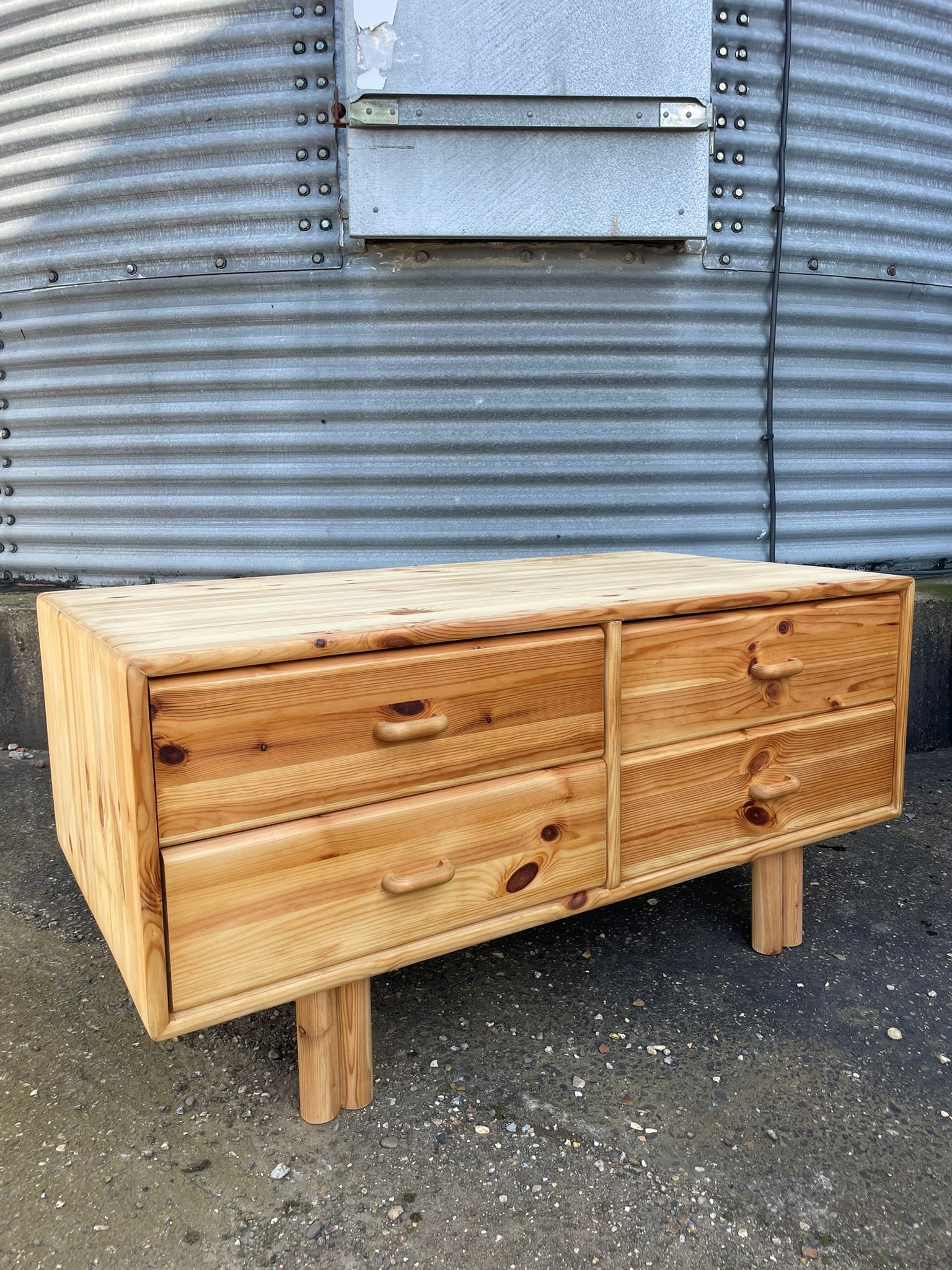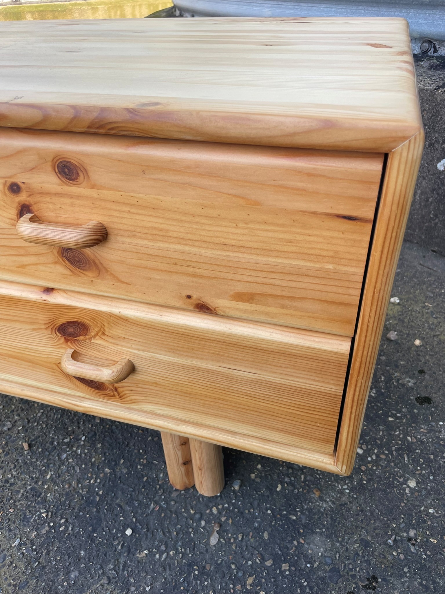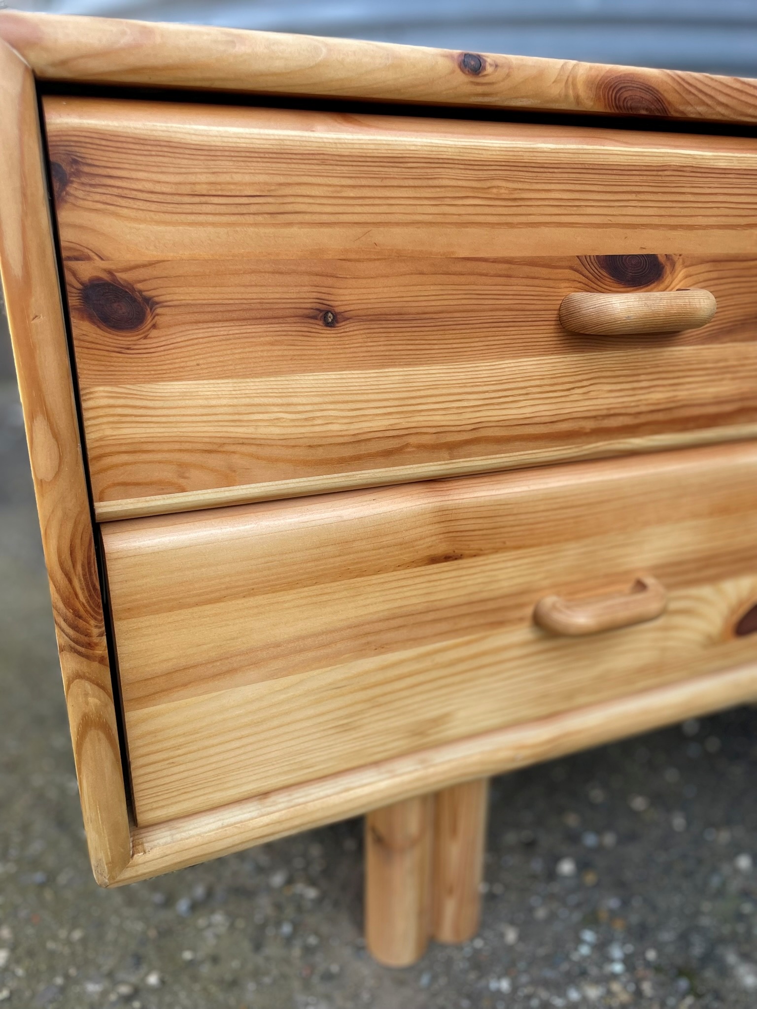 This set of drawers really capture the look of early 1980s Habitat furniture. The cabinet features curved corners and is raised on twin section round legs, the drawer handles also follow the curved theme.