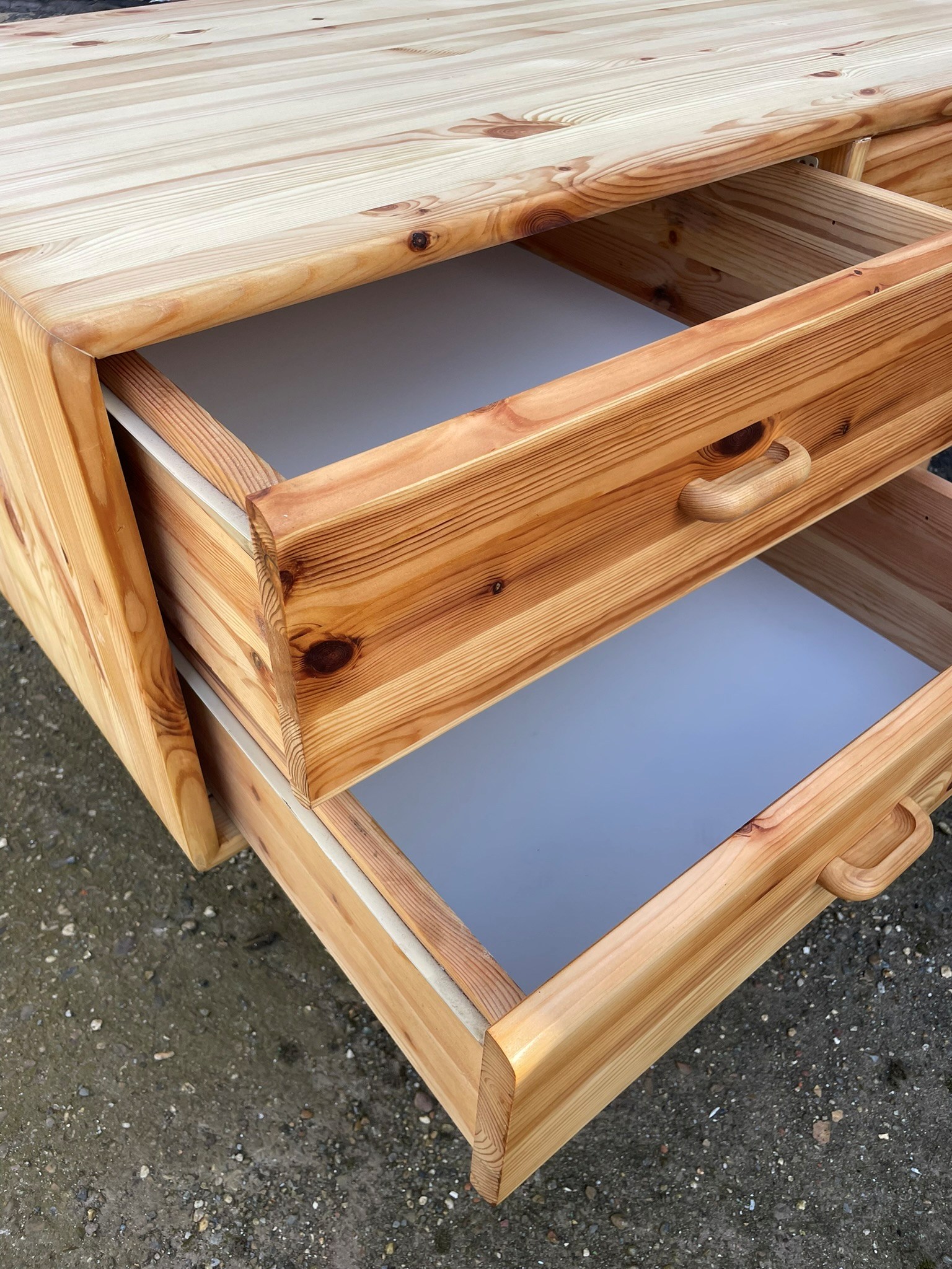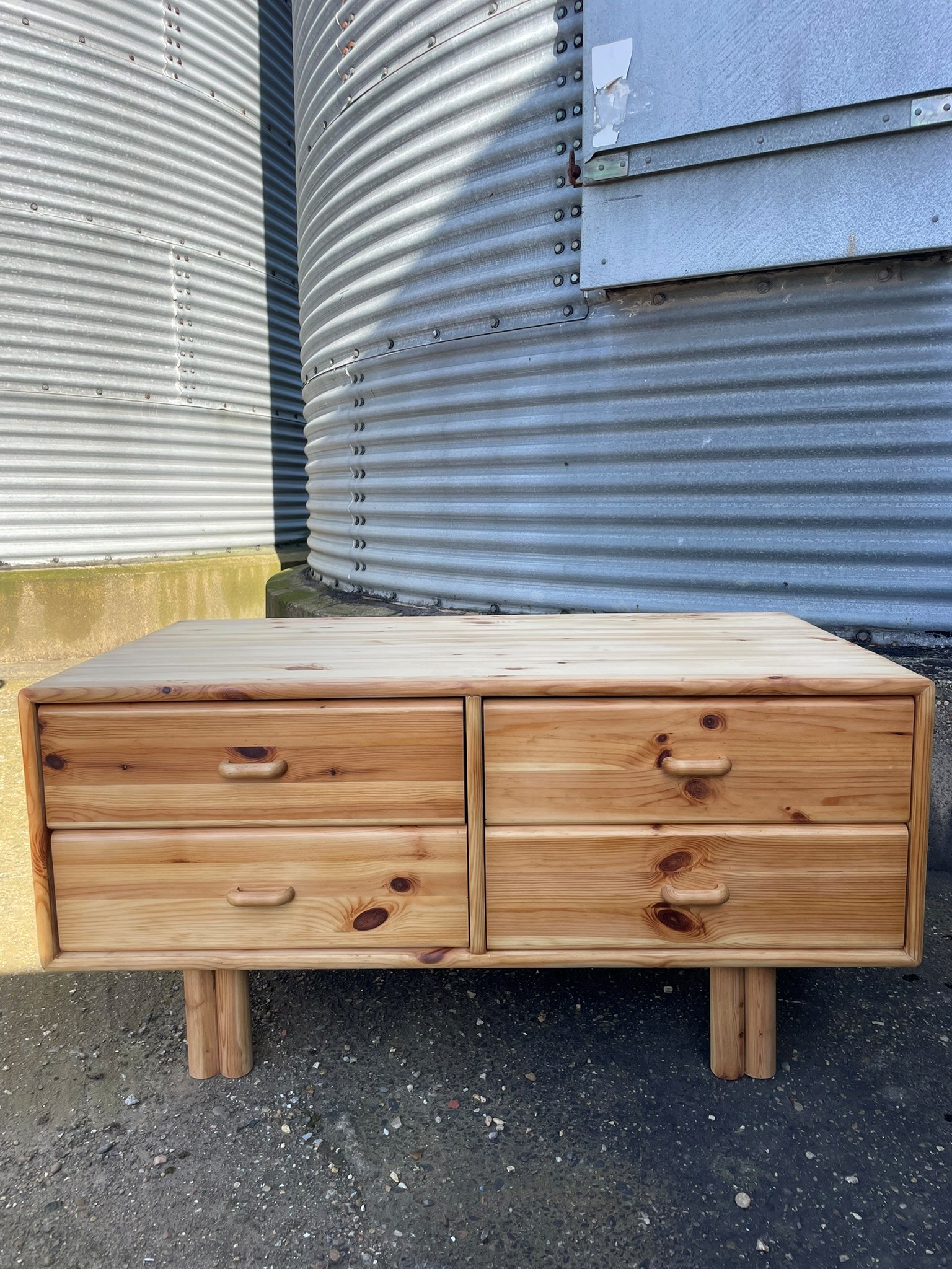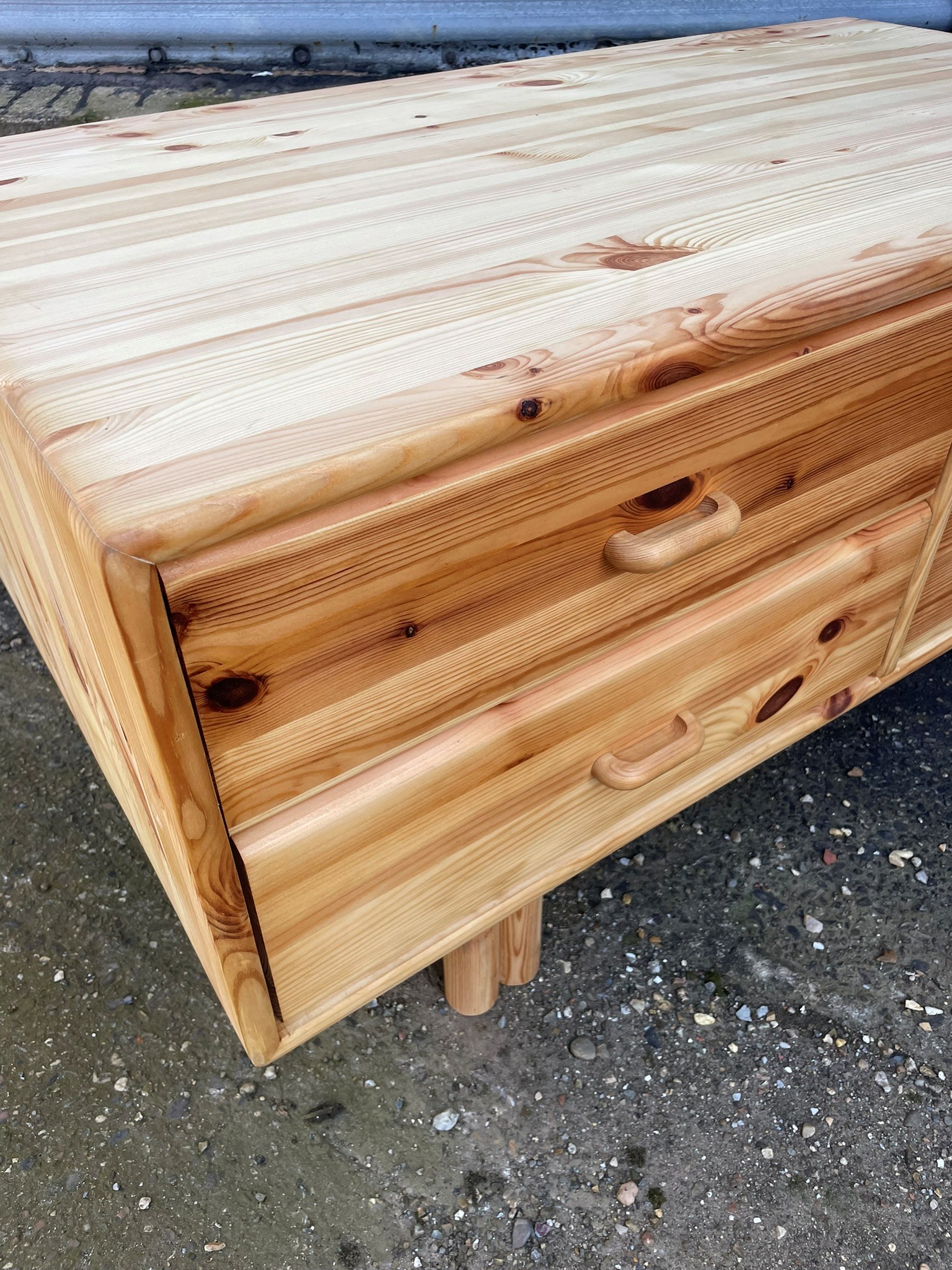 This set of drawers really capture the look of early 1980s Habitat furniture. The cabinet features curved corners and is raised on twin section round legs, the drawer handles also follow the curved theme.
