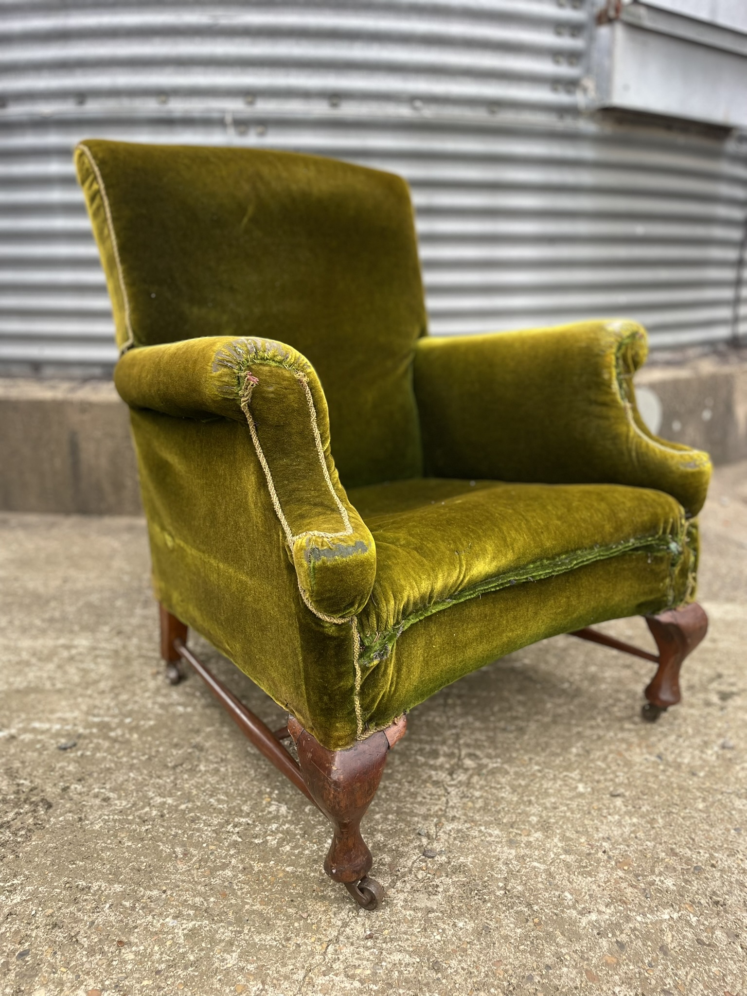 A well worn green velvet armchair on mahogany legs with its original brass wheels on all four legs.