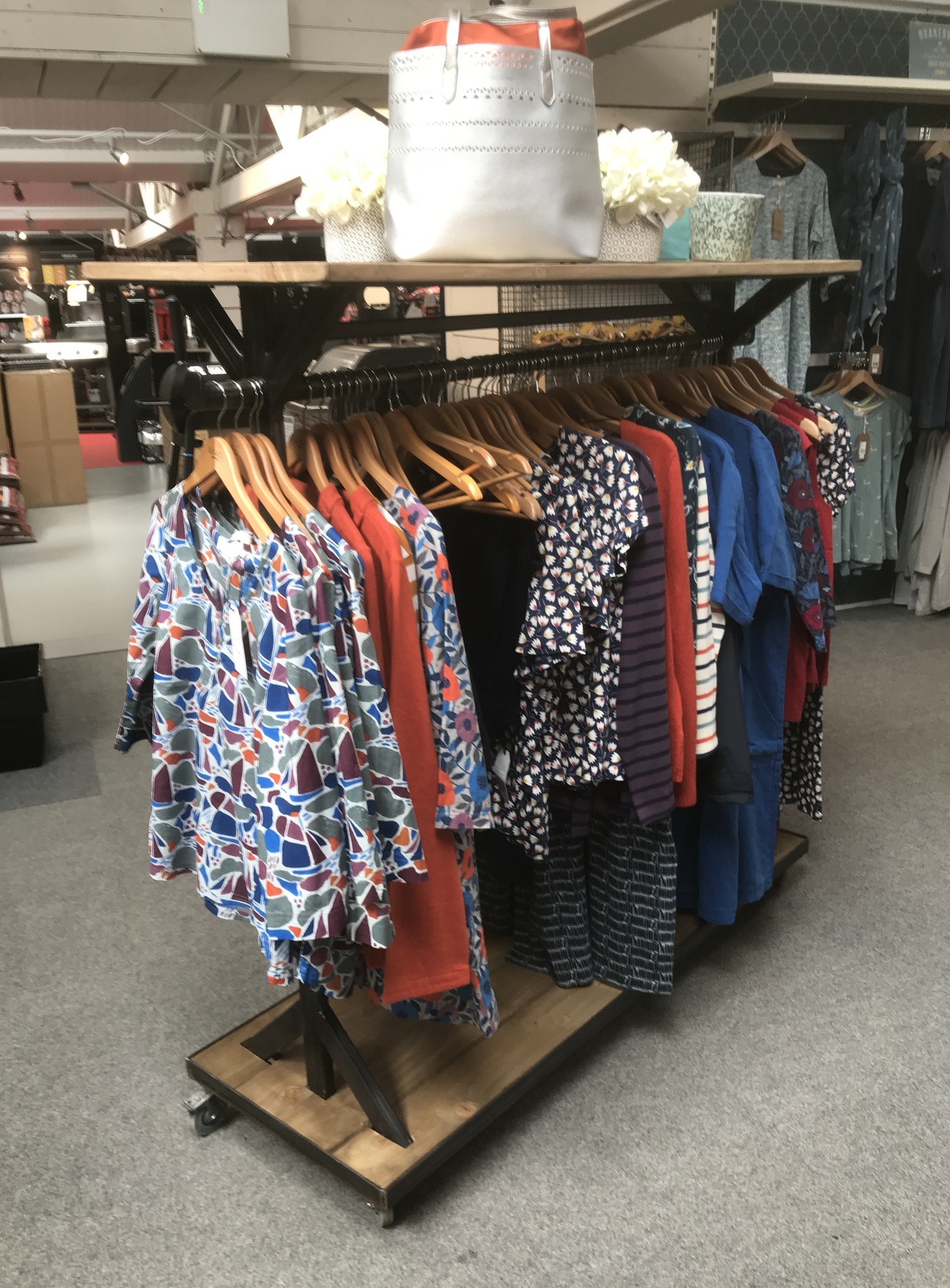 These rails were commissioned across four branches for a lifestyle brand. They feature wooden plank shelves to the base and top, stub rails at each end, and an extra square section rail to allow for 'waterfall' hanging brackets to be fitted at 90 degrees to the main rail as and when needed. These were also supplied, chemically treated to match the mild steel used for the frames.