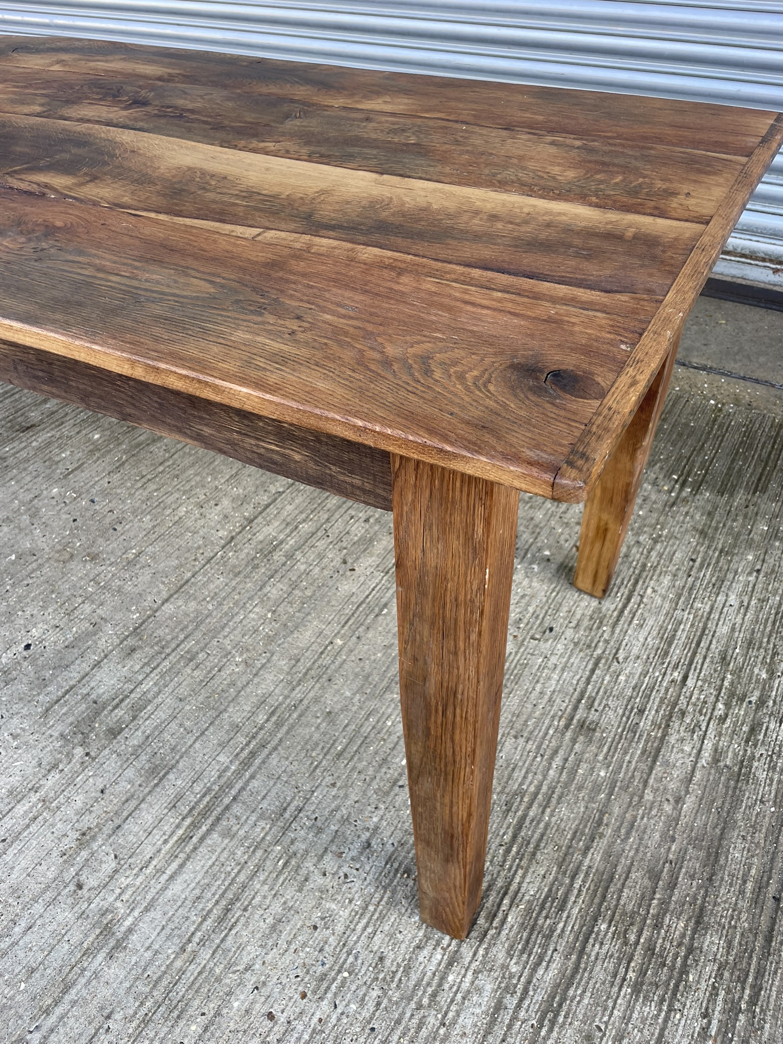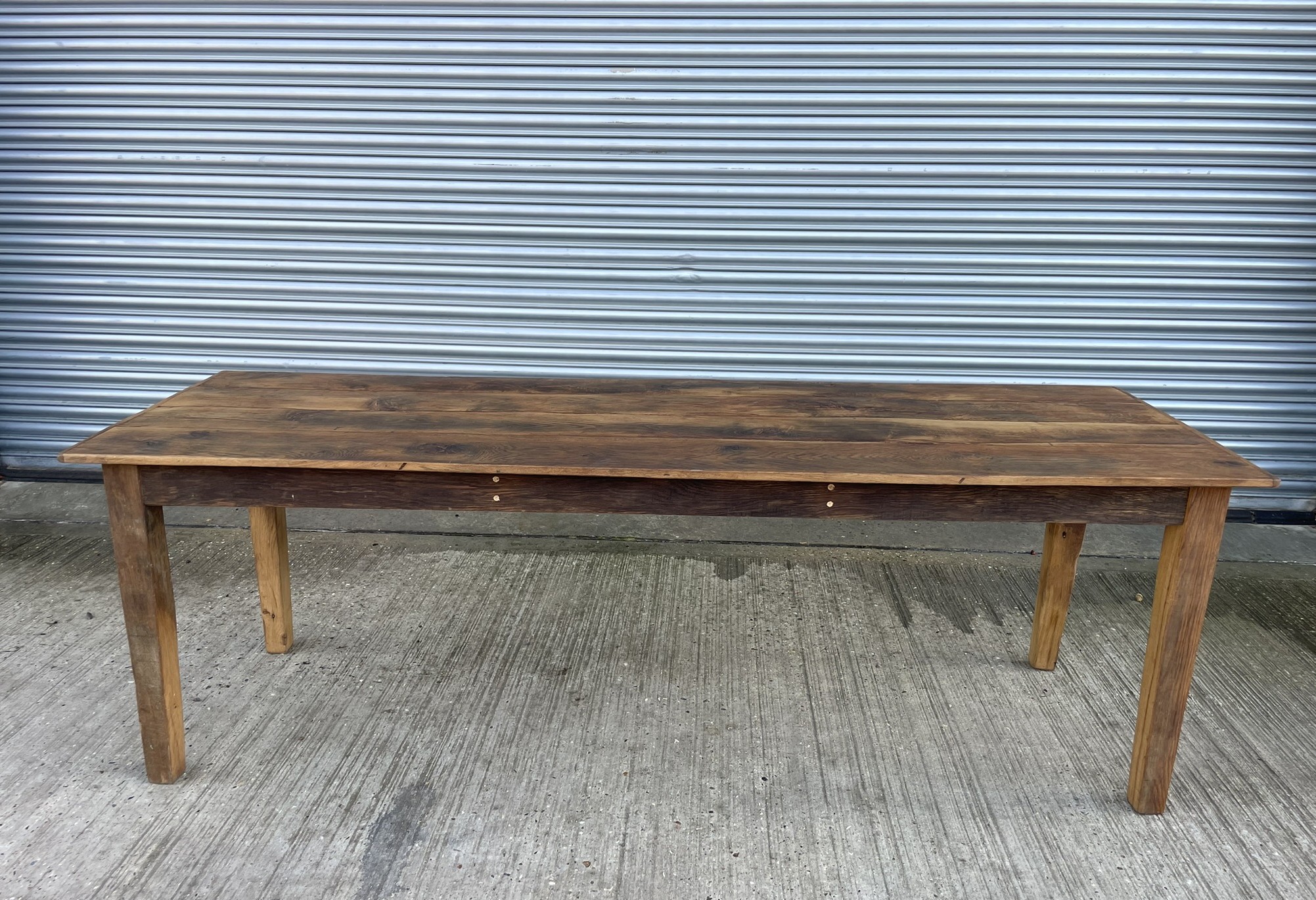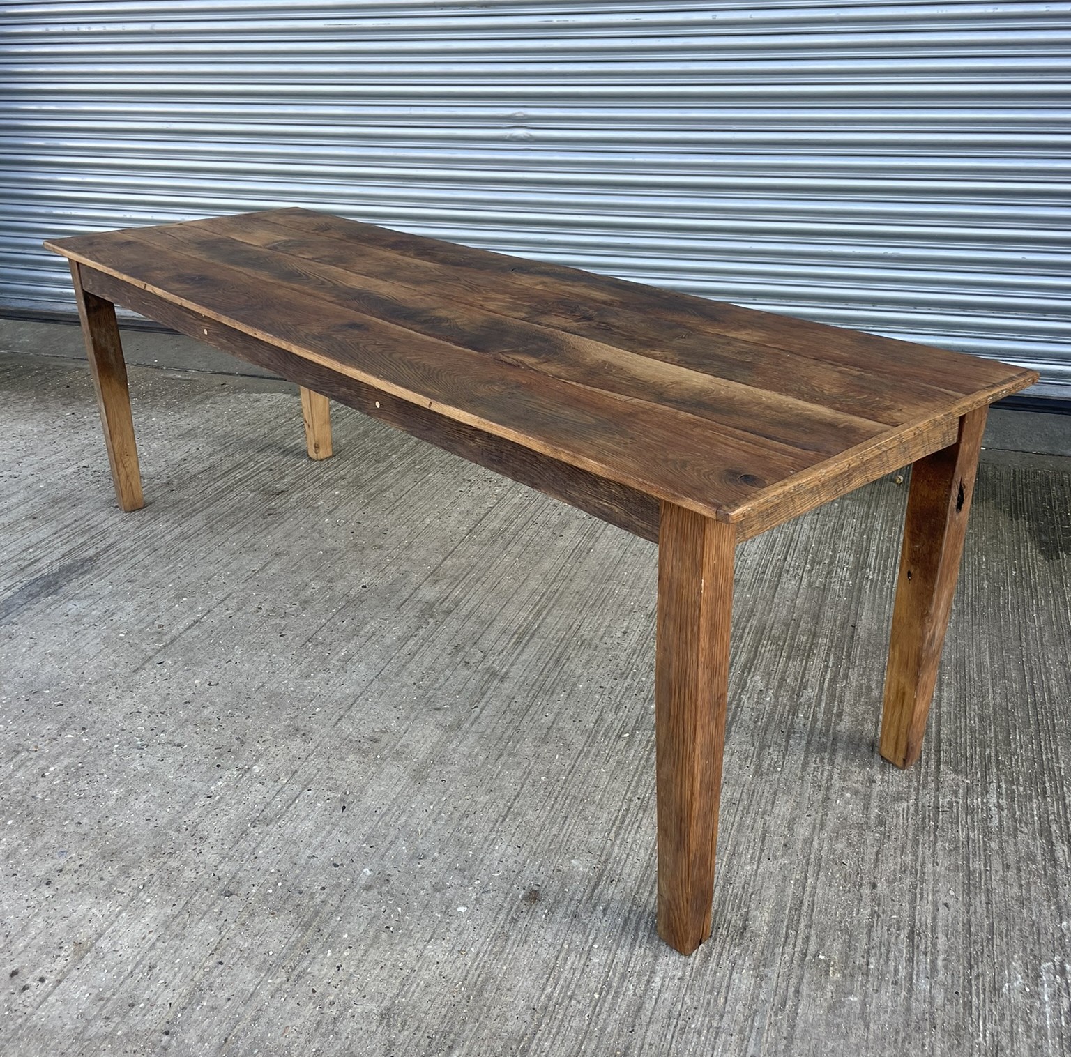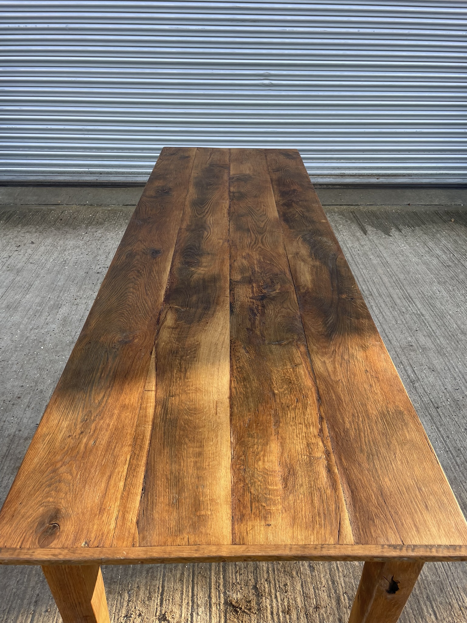 A handmade reclaimed elm table. Four plank top with 'cheeseboard' ends. Tapering square legs. The legs are removeable for easy delivery/installation. The stunning grain and patina is brought out with the oiled finish that gives the table an easily maintained wipe clean surface. Being hardwood this table could also be used outside although it would need to be covered in winter and very bad weather.225cm long