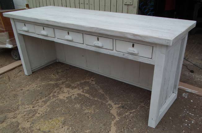 A shop counter made from reclaimed timber with salvaged laboratory drawers. Whitewash finish. We can make counters similar to this in either natural or painted finishes, please enquire for pricing.