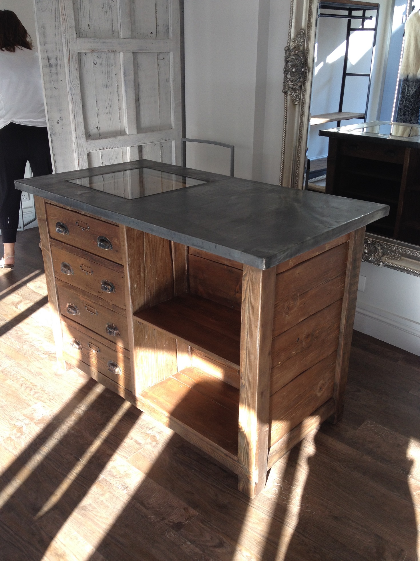 A serving counter commissioned for an independent womens clothing retailer, made from reclaimed timber with an aged zinc top and inset glass viewing window for jewellery display.
