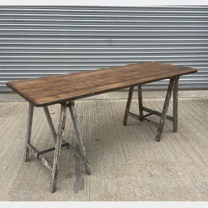 A plank top table consisting of two folding trestles and a pine plank top. The top has been sanded and finished in a low sheen water based lacquer to give a useable wipe down surface that retains all of the colour and character of the pine planks. The trestles look to be hardwood and have a worn grey paint finish with lots of flecks and spots of other paint colours. Thick cloth webbing sets the legs to their width when the trestles are opened.183cm wide 66cm deep 75cm high